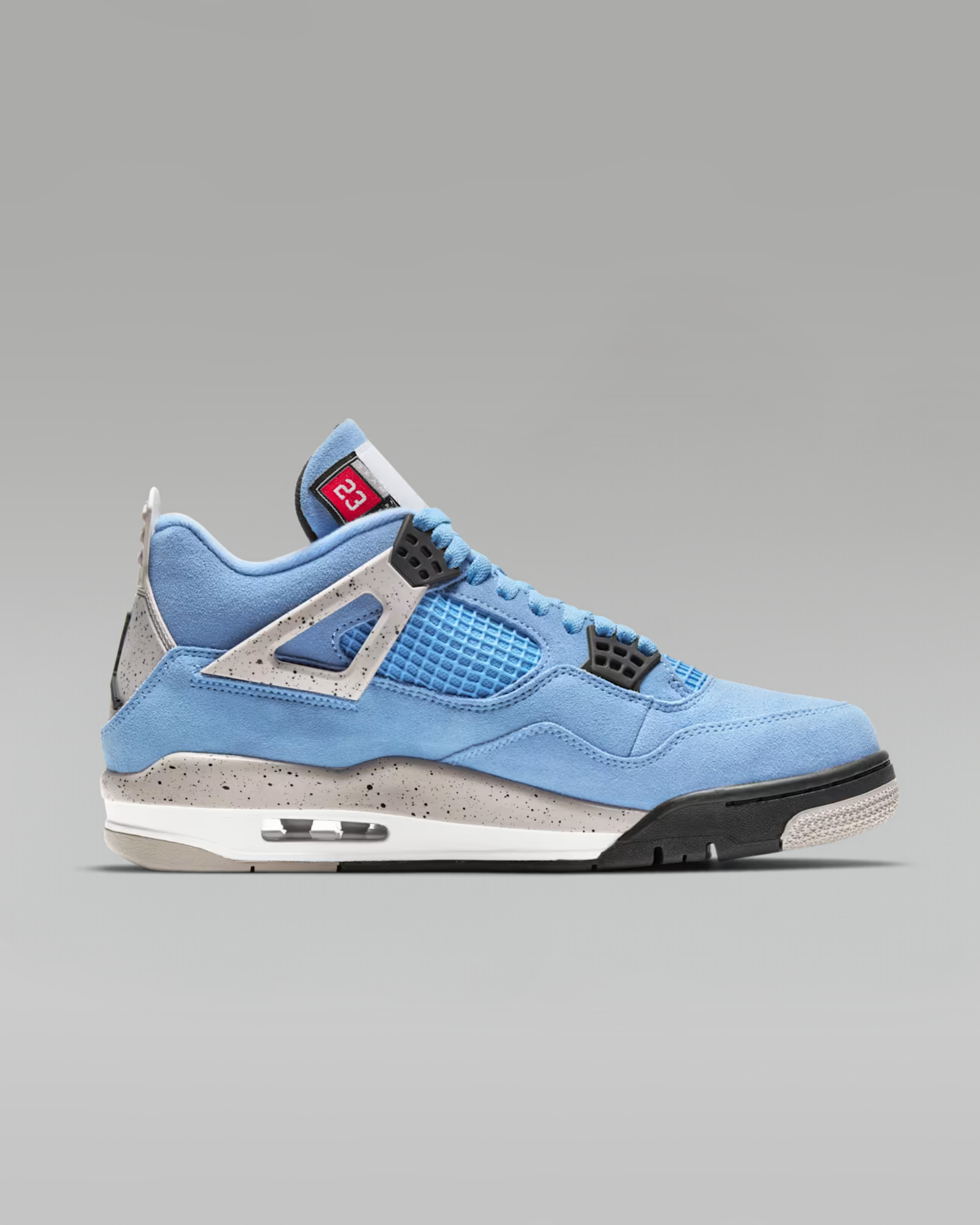 Taking after a player-exclusive make-up created for one of the brand's leading institutions, this all-new rendition of the Air Jordan 4 combines premium materials with a time-honoured colour scheme. The shoe showcases a genuine suede leather upper in University Blue, along with OG mesh netting on the quarter panel and tongue bottom. Nodding to brand heritage, the style incorporates a cement splatter print throughout, and includes a woven tag depicting MJ's number 23 on the tongue.